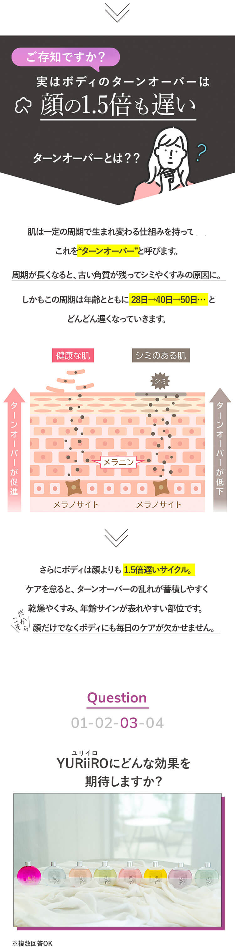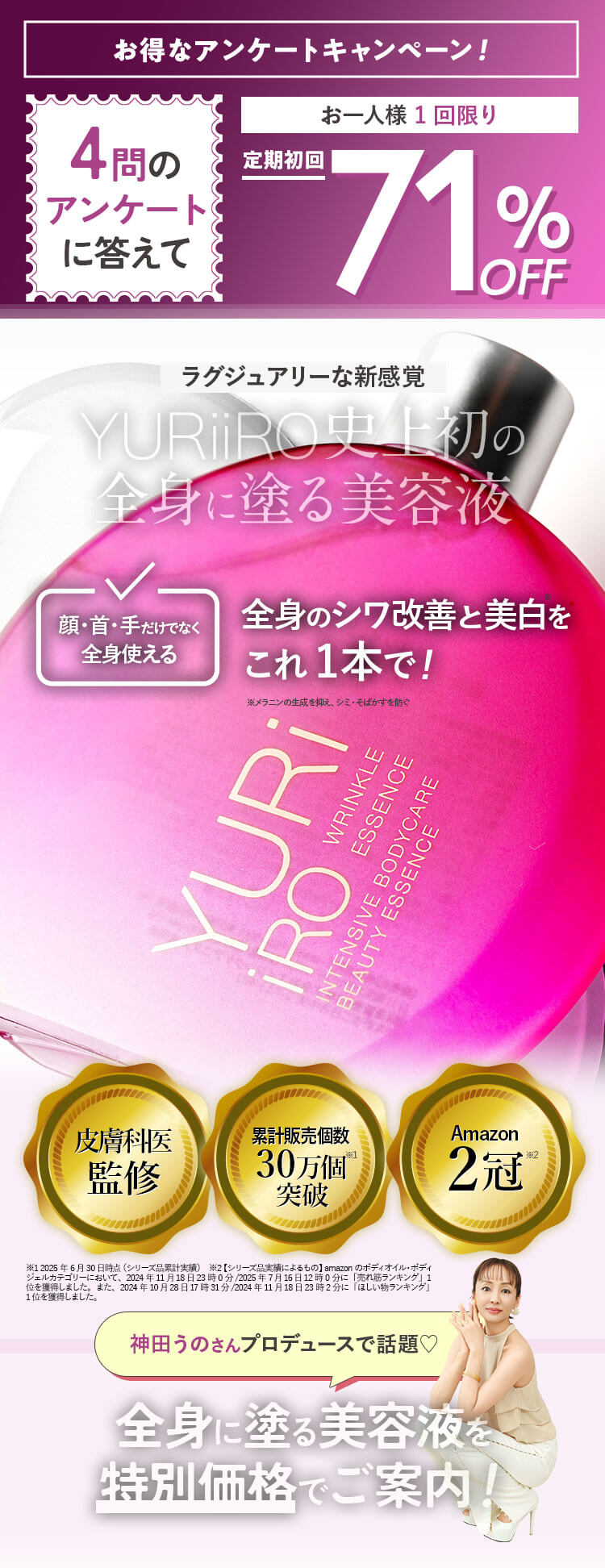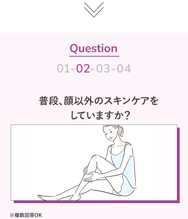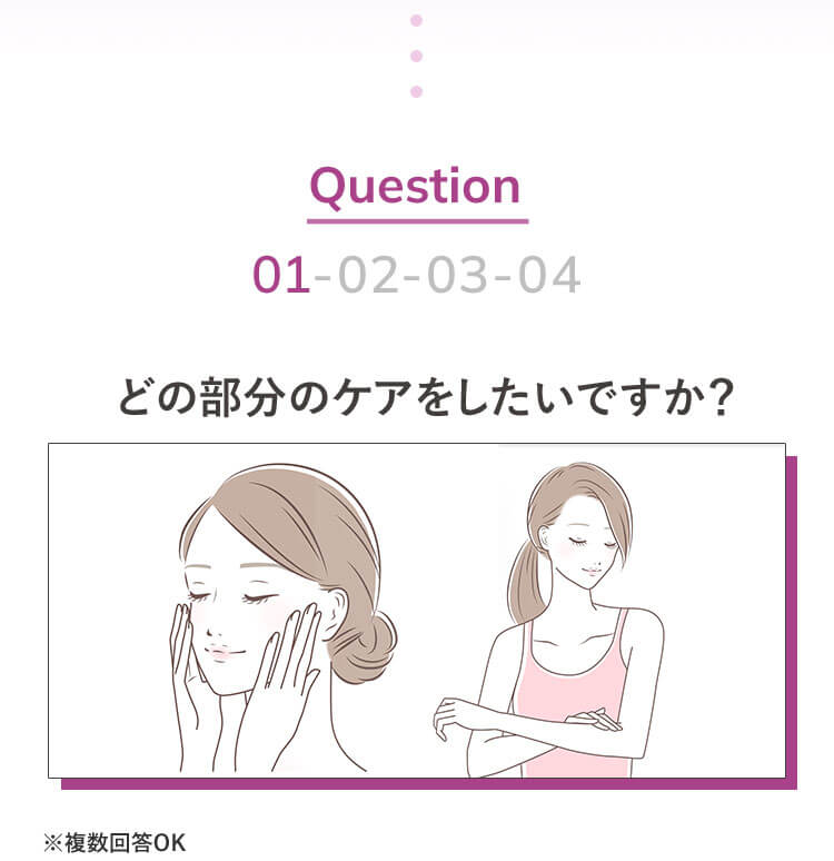 顔 (目元・口元など) 首・デコルテ 手の甲・腕 ボディ(ひじ・ひざ・かかとなど) 特にないけど予防ケアしたい している していない 顔のシワを改善したい 首・デコルテのたるみをケアしたい 手の甲のシミ・くすみを予防したい 腕や脚の乾燥小ジワをケアしたい 全身のハリ不足を整えたい その他 はい いいえ
