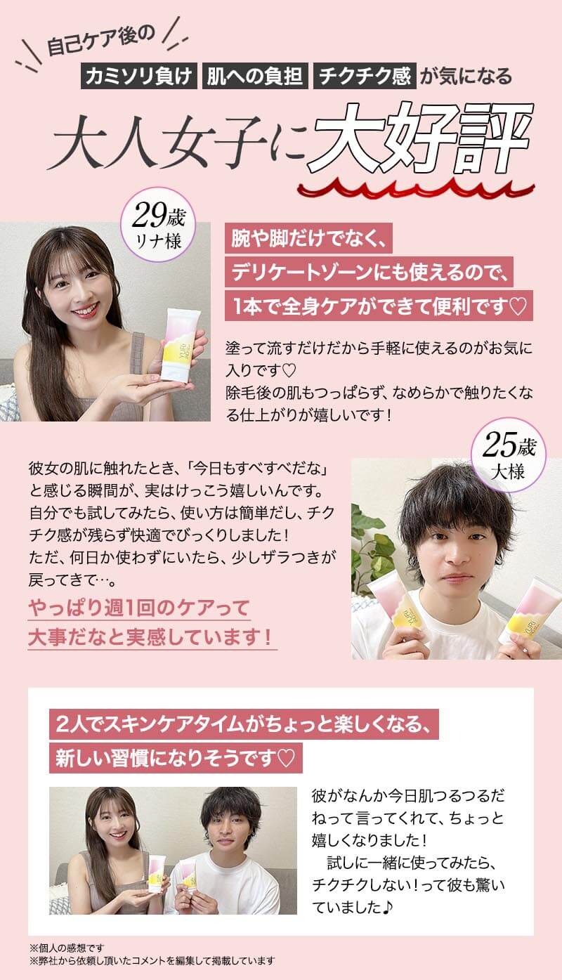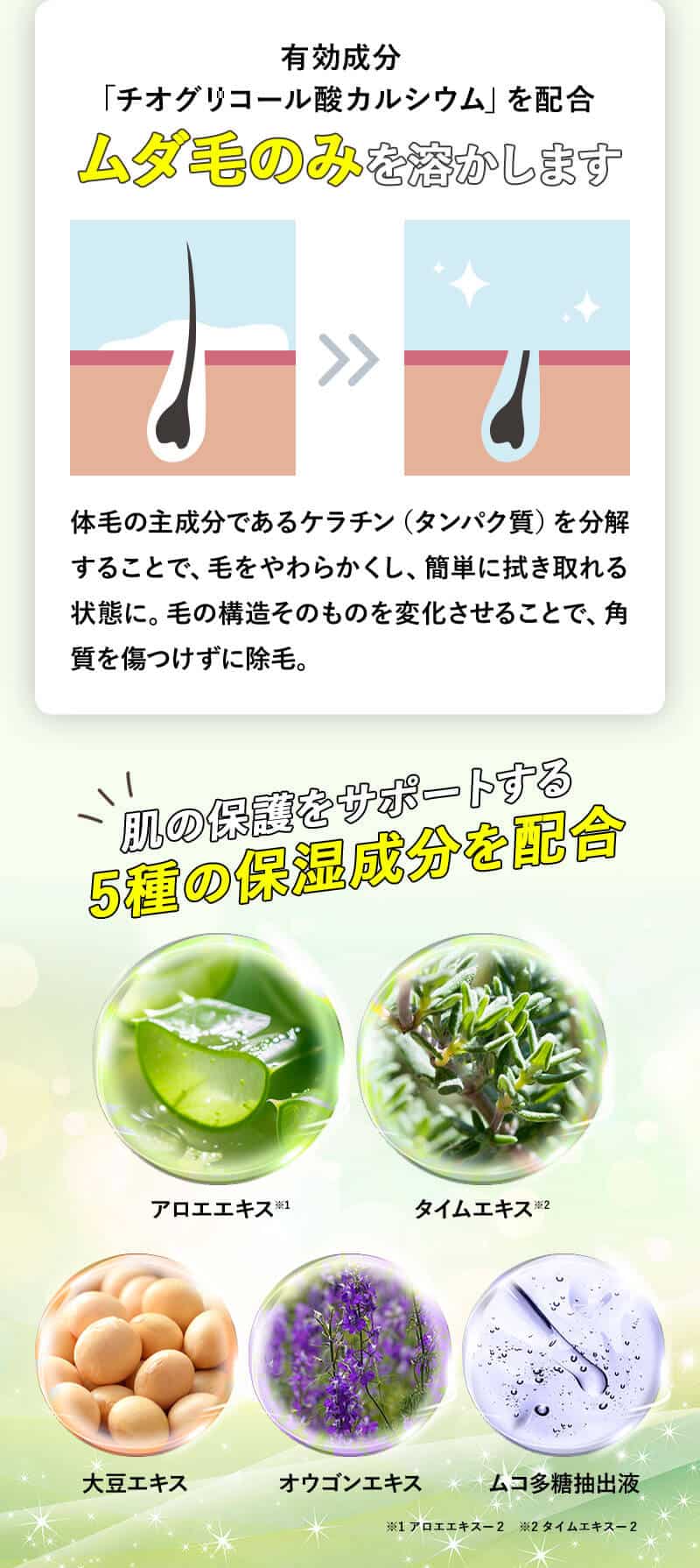 その他の成分:水酸化Na、POEセチルエーテル、流動パラフィン、セテアリルグリコシド・セテアリルアルコール、アラキルグリコシド・アラキルアルコール・ベヘニルアルコール、ジエチレントリアミン5酢酸5Na液、キサンタンガム、ムコ多糖体液、大豆エキス、アロエエキス-2、オウゴンエキス、タイムエキス-2、BG、エタノール、赤102、黄203、香料